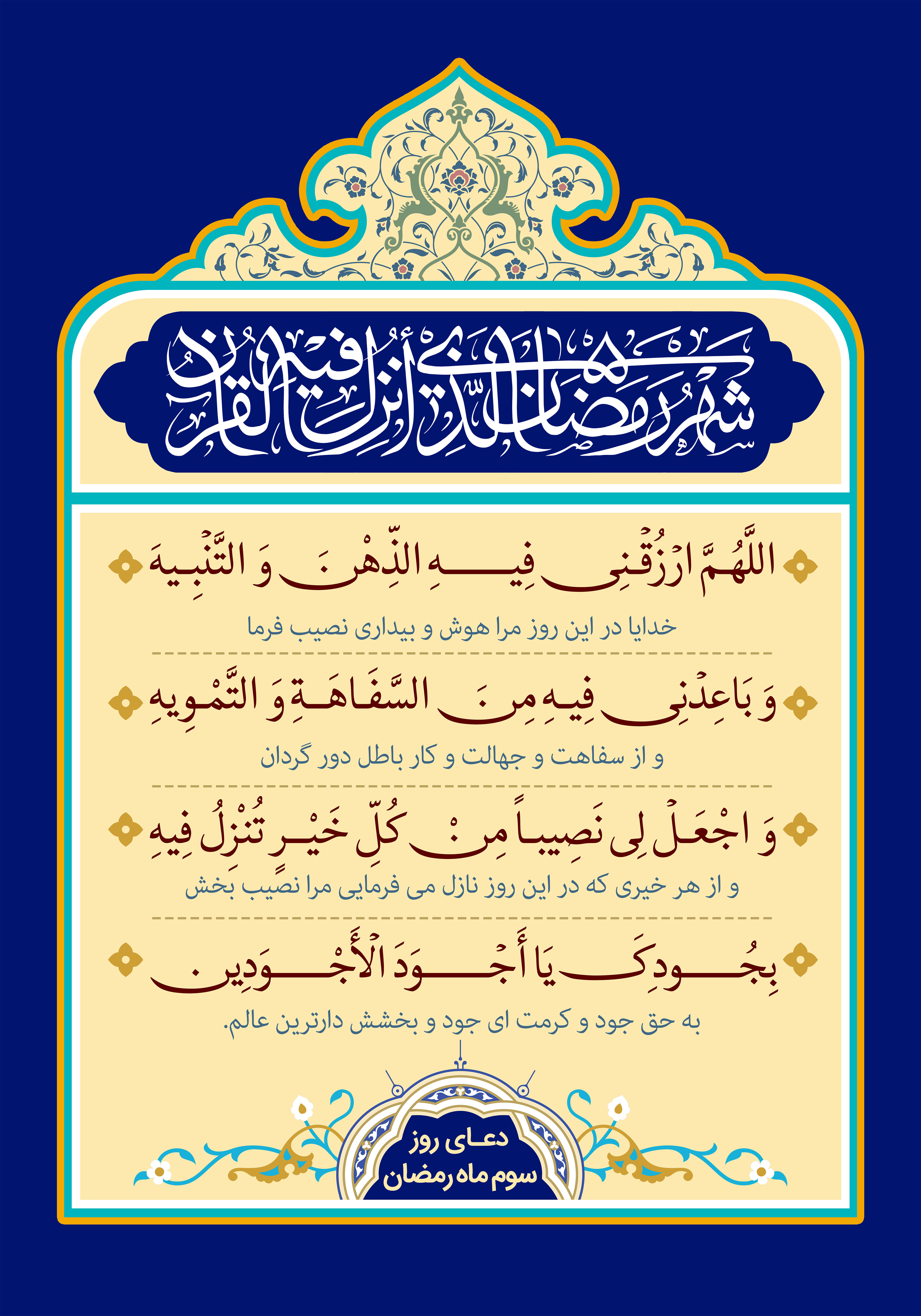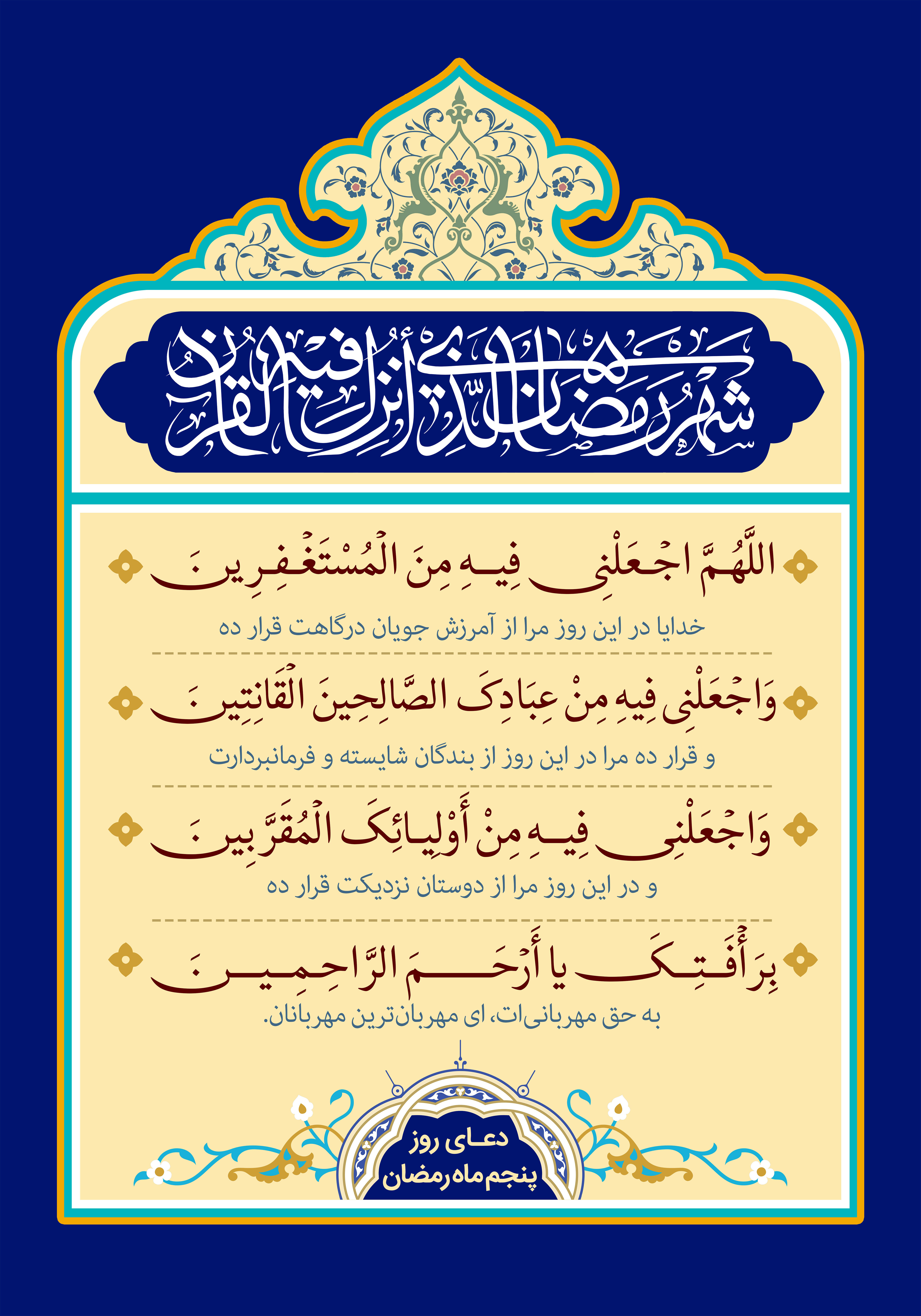 اَلْحَمْدُ لِلَّهِ الَّذِی هَدَانَا لِحَمْدِهِ وَ جَعَلَنَا مِنْ أَهْلِهِ لِنَکُونَ لِإِحْسَانِهِ مِنَ الشَّاکِرِینَ وَ لِیَجْزِیَنَا عَلَى ذَلِکَ جَزَاءَ الْمُحْسِنِینَ وَ الْحَمْدُ لِلَّهِ الَّذِی حَبَانَا بِدِینِهِ وَ اخْتَصَّنَا بِمِلَّتِهِ وَ سَبَّلَنَا فِی سُبُلِ إِحْسَانِهِ لِنَسْلُکَهَا بِمَنِّهِ إِلَى رِضْوَانِهِ حَمْداً یَتَقَبَّلُهُ مِنَّا وَ یَرْضَى بِهِ عَنَّا وَ الْحَمْدُ لِلَّهِ الَّذِی جَعَلَ مِنْ تِلْکَ السُّبُلِ شَهْرَهُ شَهْرَ رَمَضَانَ شَهْرَ الصِّیَامِ وَ شَهْرَ الْإِسْلاَمِ وَ شَهْرَ الطَّهُورِ وَ شَهْرَ التَّمْحِیصِ وَ شَهْرَ الْقِیَامِ الَّذِی أُنْزِلَ فِیهِ الْقُرْآنُ هُدًى لِلنَّاسِ وَ بَیِّنَاتٍ مِنَ الْهُدَى وَ الْفُرْقَانِ فَأَبَانَ فَضِیلَتَهُ عَلَى سَائِرِ الشُّهُورِ بِمَا جَعَلَ لَهُ مِنَ الْحُرُمَاتِ الْمَوْفُورَةِ وَ الْفَضَائِلِ الْمَشْهُورَةِ فَحَرَّمَ فِیهِ مَا أَحَلَّ فِی غَیْرِهِ إِعْظَاماً وَ حَجَرَ فِیهِ الْمَطَاعِمَ وَ الْمَشَارِبَ إِکْرَاماً وَ جَعَلَ لَهُ وَقْتاً بَیِّناً لاَ یُجِیزُ - جَلَّ وَ عَزَّ - أَنْ یُقَدَّمَ قَبْلَهُ وَ لاَ یَقْبَلُ أَنْ یُؤَخَّرَ عَنْهُ ثُمَّ فَضَّلَ لَیْلَةً وَاحِدَةً مِنْ لَیَالِیهِ عَلَى لَیَالِی أَلْفِ شَهْرٍ وَ سَمَّاهَا لَیْلَةَ الْقَدْرِ تَنَزَّلُ الْمَلاَئِکَةُ وَ الرُّوحُ فِیهَا ِإِذْنِ رَبِّهِمْ مِنْ کُلِّ أَمْرٍ سَلاَمٌ دَائِمُ الْبَرَکَةِ إِلَى طُلُوعِ الْفَجْرِ عَلَى مَنْ یَشَاءُ مِنْ عِبَادِهِ بِمَا أَحْکَمَ مِنْ قَضَائِهِ